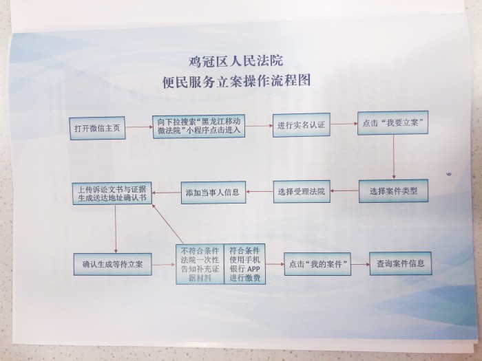 对此,鸡冠区法院立案庭结合本院实际情况,针对疫情给当事人带来的立案难问题,制定了《鸡冠区人民法院便民服务立案操作流程》和“鸡冠区人民法院便民服务立案操作流程图”来供当事人查阅。并加大网上立案的宣传力度,呼吁当事人在疫情期间优先选择网上立案。