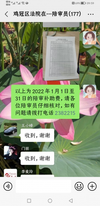 在“管委会”成立后,为保证人员陪审员均衡参审,“管委会”利用鸡冠区法院开发的人民陪审员随机选定参审系统软件以及OA办公平台,对需要人民陪审员参审的合仪案件进行随机抽选。在人民陪审员微信和QQ工作群,及时发布人民陪审员选取单,将案件案号、开庭时间、开庭地点、当事人信息等相关信息反馈给人民陪审员,做到及时、公开、透明。自2018年《人民陪审员法》立法后,鸡冠区法院做到了在职人民陪审员全员参审,年参审数量中位数为6件,最高案件参审数量未超30件上限,确保了均衡参审。