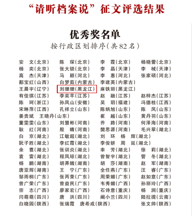 11月14日,国家档案局2025年国际档案日“请听档案说”主题征文评选结果揭晓,本次从23503篇征文作品中选出一等奖作品3篇、二等奖作品6篇、三等奖作品9篇、优秀奖82个,以及46家优秀组织奖单位。涵盖全国31个省(区、市)以及中央和国家机关、企事业单位、高校等机构。