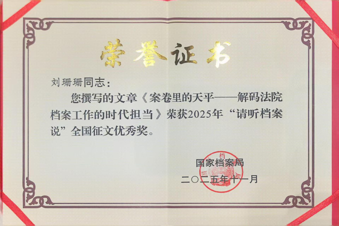 鸡冠区法院综合办公室刘珊珊凭借作品《案卷里的天平—解码法院档案工作的时代担当》脱颖而出,荣获2025年“请听档案说”全国征文优秀奖,以扎实文笔彰显法院干警专业素养与责任担当。