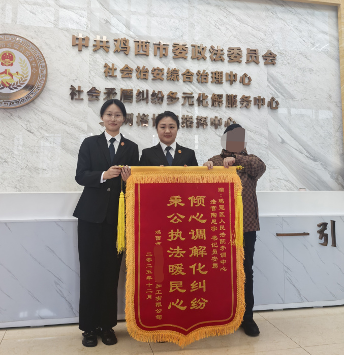 近日,鸡冠区法院立案庭暖意融融,当事人刁某手持一面绣有“倾心调解化纠纷 秉公执法暖民心”的锦旗,郑重地送到法官手中,感谢法官成功调解其与邻居王某的民间借贷纠纷,既让双方达成了一致意见,又维系了多年的邻里情谊。