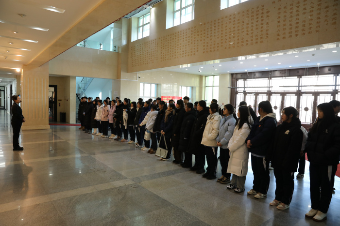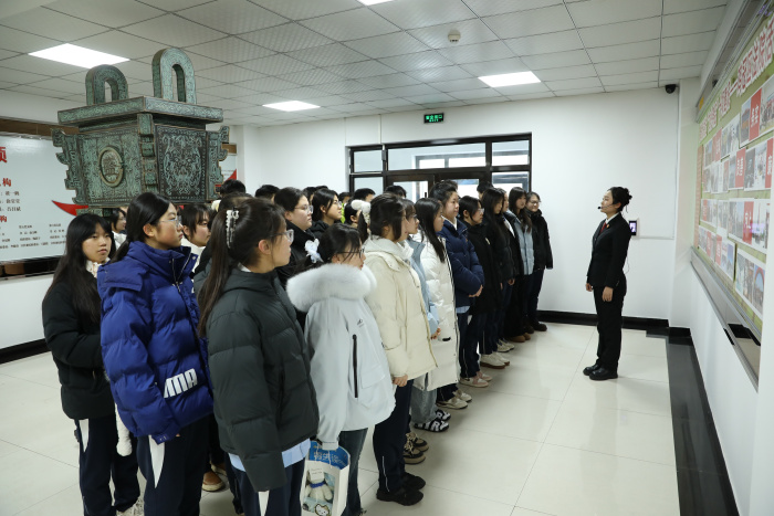 活动伊始,同学们在法院二楼大厅驻足,凝视着寓意深刻的司法浮雕,初步感受法治文化的历史厚度与精神内涵。在一楼党建与文化铸品品牌展示区,同学们通过图文资料和工作人员的生动介绍,深入认识人民法院在党的领导下,如何通过文化建设与品牌打造,践行司法为民、公正司法的初心使命。随后,大家有序参观了家事少年法庭,了解该法庭在化解家事纠纷、保护未成年人权益方面的特色机制与温情举措。