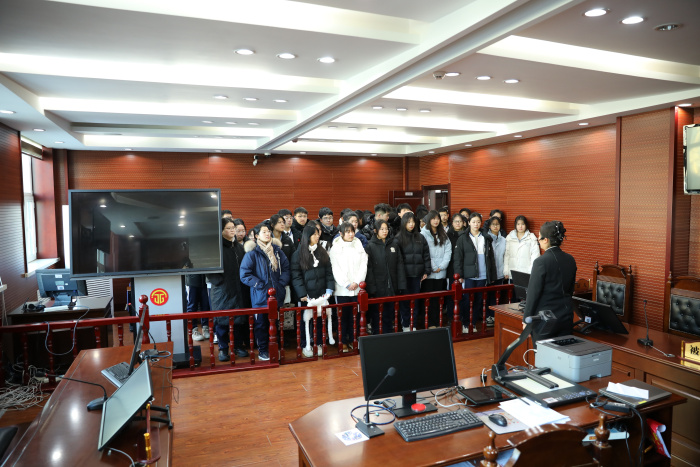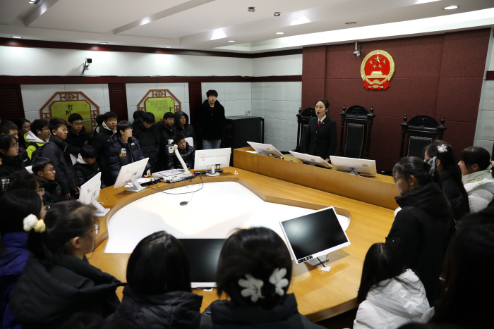 讲解过程中,同学们展现出浓厚的求知热情,不断围绕法院工作机制、诉讼流程及日常运行原理踊跃提问,互动气氛热烈。最令同学们印象深刻的是走进审判庭的亲身体验。在工作人员的鼓励下,同学们轮流走上审判席,坐上法椅,手持法槌,从“法官视角”感受法庭的庄严与责任。通过情景模拟和案例分析,大家进一步理解了审判权的运行方式,也学习了在日常生活中如何识别风险、维护自身合法权益,以及如何正确运用法律武器保护自己。