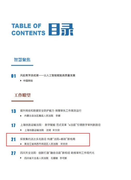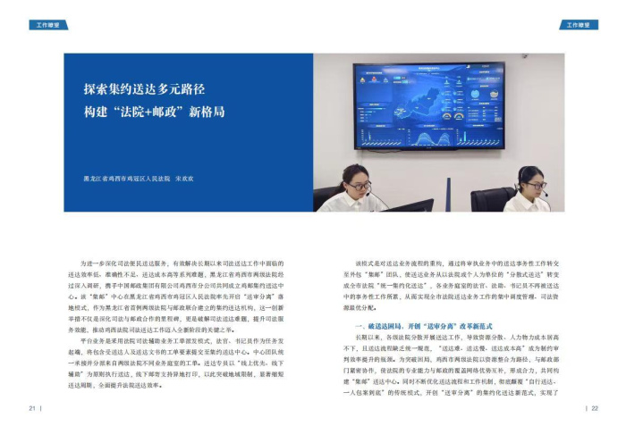 近日,由鸡冠区法院宋欢欢撰写的《探索集约送达多元路径,构建“法院+邮政”新格局》被最高院信息中心主办的《人民法院信息化工作通讯》2026年第2期总第122期“工作瞭望”栏目收录刊载。全文推介鸡冠区法院为破解“送达难”,推进审判辅助事务集约化改革,提升审执质效方面的应用探索,展现出鸡西市两级法院联合邮政部门成立“集邮”送达中心的工作实践与机制的创新成果。