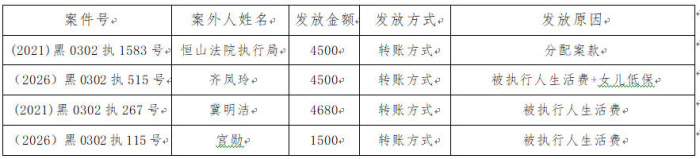 为切实巩固执行案款清理成果,加强执行案款管理,依法维护当事人合法权益,防范廉政风险,确保执行案款发放规范有序、及时高效。依据《黑龙江省高级人民法院向案外人发放执行案款公示制度》的规定,现将向案外人发放执行案款信息予以公示,公示期间:2026年3月25日起至2026年3月31日止。