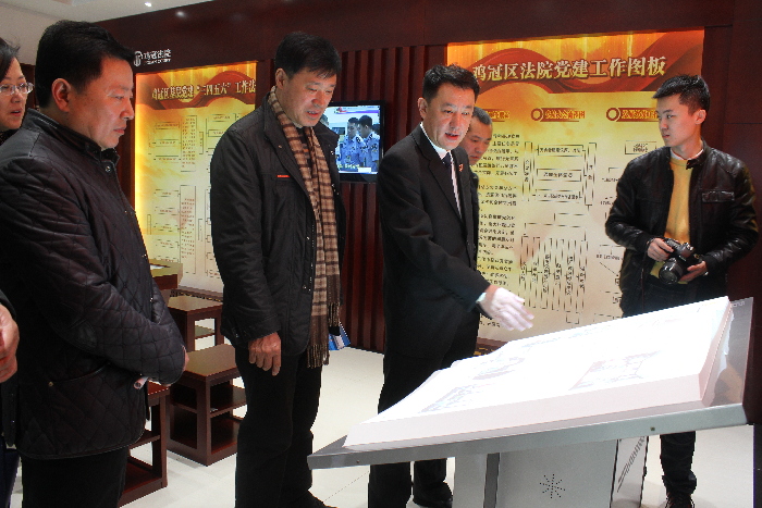 六五普法工作组首先视察了鸡冠区法院诉讼服务中心,详细的了解立案登记制工作开展情况、司法便民服务情况、12368平台工作情况等一系列工作;接着了解了鸡冠区法院开展一系列的普法活动。例如开展法官讲堂活动、送法进社区、送法进乡村、送法进校园等活动;最后视察了“崇廉厚德苑”、“党员活动室”、“院史室”,六五普法工作组对鸡冠区法院在普法工作中,各阶段开展的普法活动以及取得的成绩,给予了高度评价。