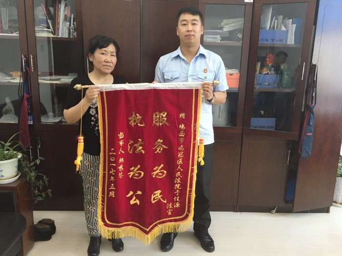 近日,申请执行人韩某手拿锦旗来到鸡冠区法院执行局,感谢于佳原法官在处理案件过程中,严肃执法,热情耐心,全心为民,方法得当,效果理想。