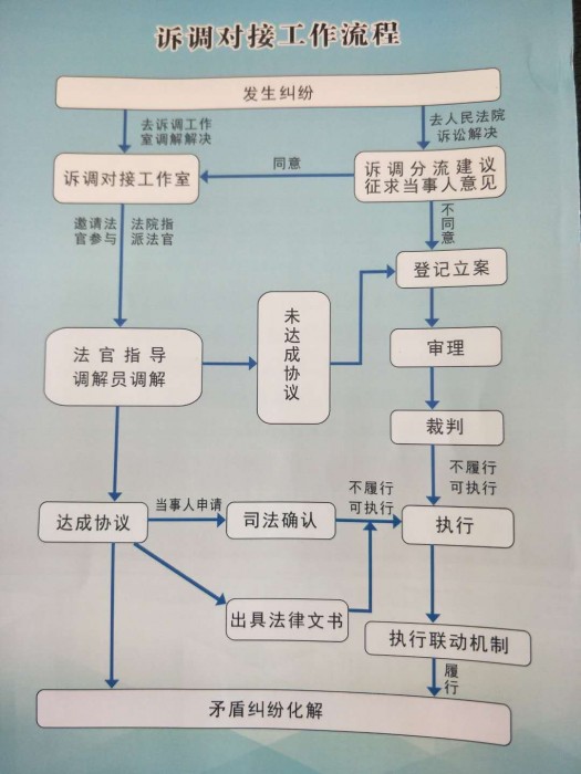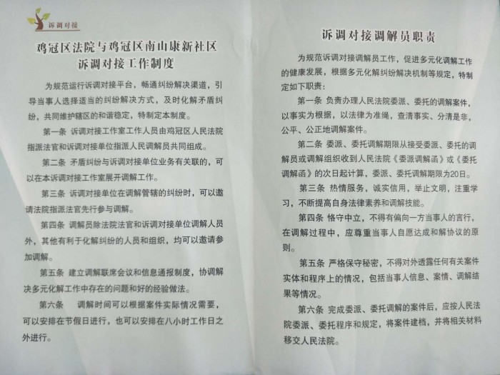 诉调对接工作是鸡冠区法院在司法改革中的有益尝试,在正式立案前,对案件事实清楚、权利义务关系明确、适宜调解的简单案件,并属于该社区管辖范围内的,委派到所属社区诉调对接工作室,由调解人员进行调解。对已立案有调解可能的,邀请该辖区调解员到法院诉调对接中心,协助调解法官和人民陪审员现场调解,对进入诉讼程序的案件调解贯穿始终,由业务庭委托诉调对接社区进行调解。调解成功后逐案登记,形成调解信息档案,根据当事人需求制作司法确认书或调解书,当日送达;如未能达成调解协议,则由调解员出具调解小结,注明双方地址、诉讼请求、争议焦点和相关证据,由法院进行登记立案,使大量矛盾纠纷在诉前、诉中得到有效化解,缓解了法院办案压力,达到了集约办案的目的。