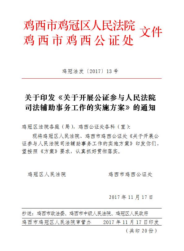 2、建立协作机制。鸡冠区法院与鸡西市鸡西公证处应当根据工作需要,定期召开联席会议,研究解决诉讼与公证对接过程中出现的问题。鸡西市鸡西公证处向鸡冠区法院派出一组由一名二级公证员和1-2名助理公证员组成的司法辅助工作组,及时解决案件审理中遇到的有关公证事宜。