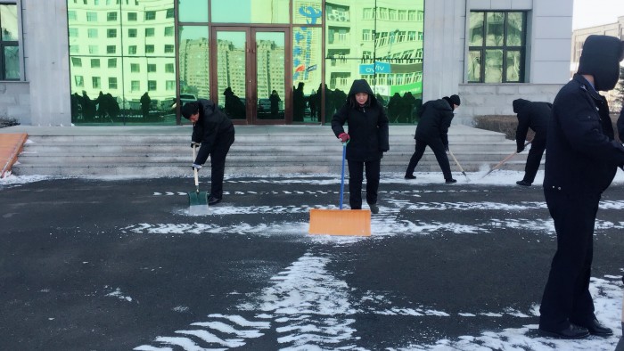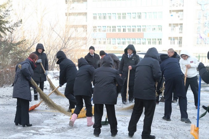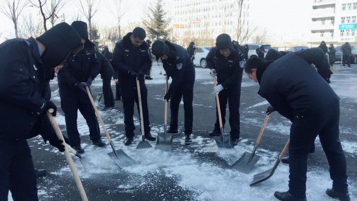 气温虽低但冷却不了干警们的劳动热情,冰雪虽坚却抵挡不住干警们的干劲十足。党组书记、院长马宝君及在院领导不辞辛苦,身先士卒,带领全院干警冲锋上阵,铲冰镐、除雪锹、大扫把轮流上阵,裤脚沾满了雪,围巾结上了冰……最终,院内的积雪被合理安放,道路的坚冰消失不见,水泥路面重见阳光,来院人民群众和车辆的安全有了保障。