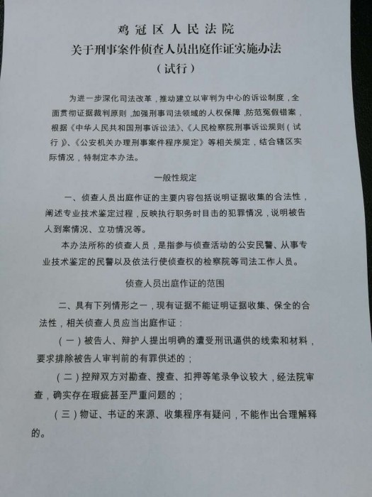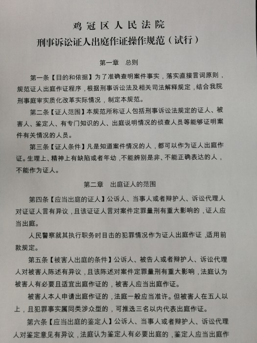 面对如何破解刑事案件证人、鉴定人、侦查人员、有专门知识的人出庭率低这一困扰刑事审判的老大难问题,鸡冠区法院迎难而上,探索出了刑事诉讼证人出庭的工作方法,制定了《鸡冠区人民法院刑事诉讼证人出庭作证操作规范(试行)》、《鸡冠区人民法院关于刑事案件侦查人员出庭作证实施办法(试行)》,从而全程保障证人、鉴定人、侦查人员、有专门知识的人出庭作证。