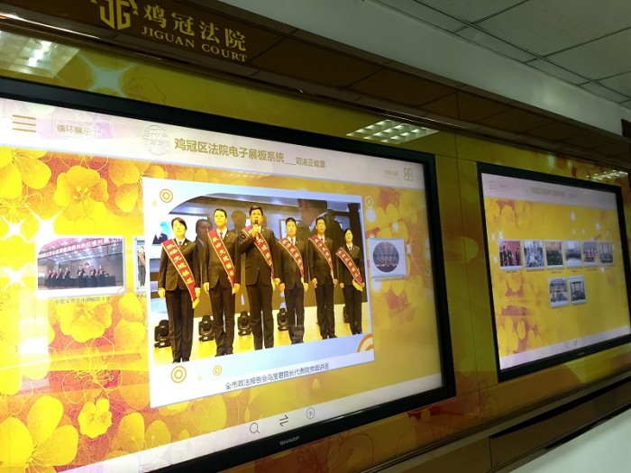 据悉,鸡冠区法院电子展板系统于2017年9月上线,应用在诉讼服务中心和院史室展示法院文化内容,分为鸡冠风采、领导关怀、党建工作、司法改革、青年文明号等几大板块,支持内容触控浏览、图片循环播放等功能。以电子展板系统替代原有的照片墙展板,不仅提升了法院展示墙的现代美感,也为更新法院展板内容及照片提供了便利,同时也扩展了图文展示的空间,并对法院的重要图文进行存档,为司法公开提供了电子展示平台,增添了智慧型元素。