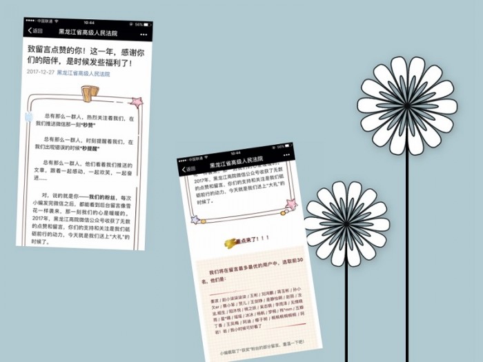 2017年12月27日,值此年终岁尾之际,黑龙江省高级人民法院公众号推送的一篇《致留言点赞的你》在工作之余给我们增添了许多温暖与感动。