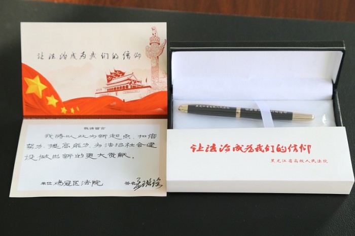 省法院在本年度公众号文章中留言最多最优的用户中选取前30名评为优秀评论员,我院研究室孟璐瑶在全省用户中脱颖而出,成为鸡西法院系统唯一一位优秀评论员,手捧着省法院邮寄过来的满满心意——留言卡与纪念笔,我们既高兴又感动,看着印有“让法治成为我们的信仰”的纪念笔,我们内心无比激动,为作为一名法院干警而感到骄傲与自豪,同时,我们也感到我们的责任之重大,正如习近平总书记在关于《中共中央关于全面推进依法治国若干重大问题的决定》中强调的“法律是治国之重器,法治是国家治理体系和治理能力的重要依托”,只有让法治成为我们的共同信仰,才能在全社会树立起法律权威。我们必须常怀“崇法明德,笃行至善”之心,时刻牢记自己的法治使命,为加快建设法治国家而终生奋斗!