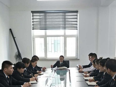 近日,鸡冠区法院办公室主任杨磊带领全体干警在诉讼服务中心四楼召开会议,学习党组书记、院长马宝君在区人大作的工作报告。