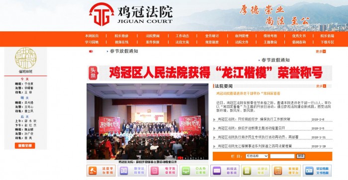 为贯彻落实十九大会议精神,进一步提高宗旨意识,提升司法服务水平,鸡冠区法院在新春即将来临之际,不断完善网站功能,优化服务性能,近期新增了形式新颖的值排班浮动模块,为法院干警的值排班工作带来了极大便利。