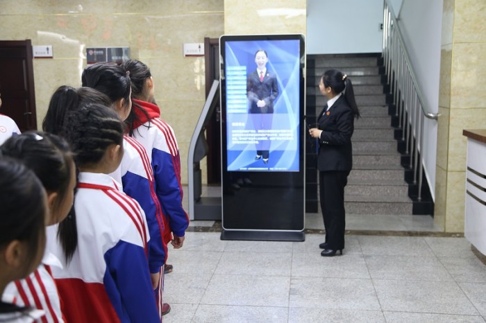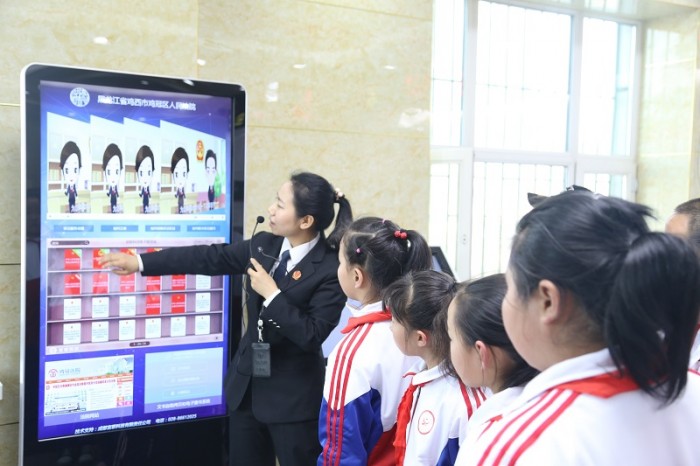 第一次参观法院,同学们显得既激动又兴奋。解说员向同学们介绍了法院大厅浮雕的内容和寓意.“小客人”们饶有兴趣地参观了法警安检门、考勤机、案件查询机等办公设备,一步步地向他们揭开法院神秘面纱,让他们从小对法院、法官的职业有一个比较直观的认识。